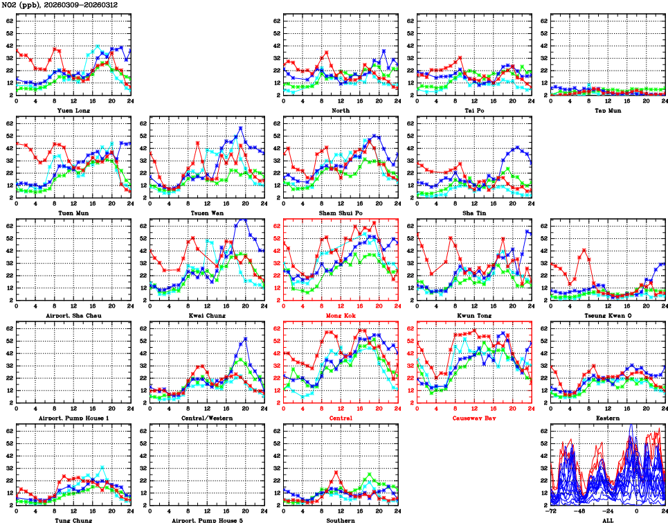 | Air Quality Data Time Series for NO2 (2026/03/12) | ( Line colors: Day -3 Day -2 Day -1 Current day ) | 2D Map Current AQHI |