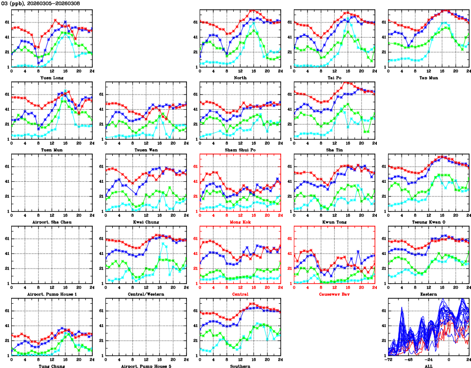 | Air Quality Data Time Series for O3 (2026/03/08) | ( Line colors: Day -3 Day -2 Day -1 Current day ) | 2D Map Current AQHI |