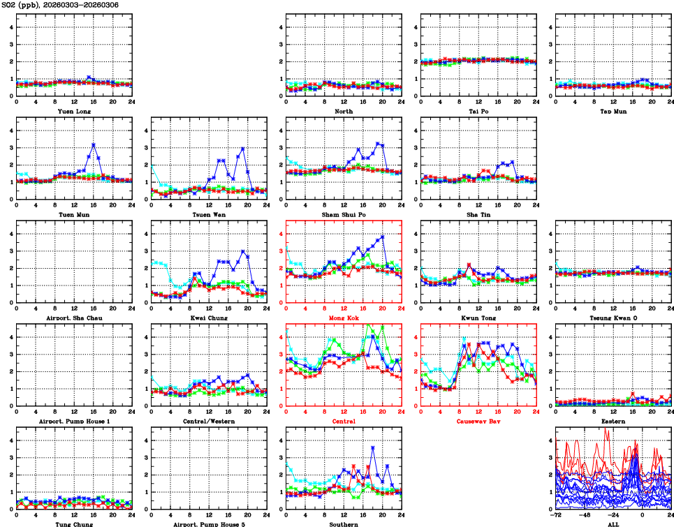 | Air Quality Data Time Series for SO2 (2026/03/06) | ( Line colors: Day -3 Day -2 Day -1 Current day ) | 2D Map Current AQHI |