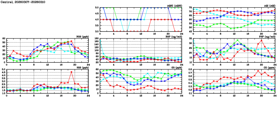 | Air Quality Data Time Series in Central (2026/03/10) | ( Line colors: Day -3 Day -2 Day -1 Current day ) | 2D Map Current AQHI |