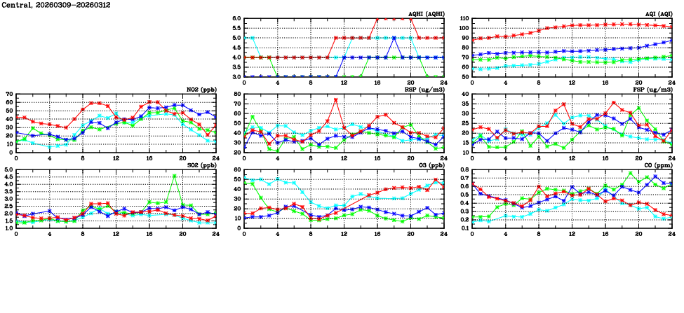 | Air Quality Data Time Series in Central (2026/03/12) | ( Line colors: Day -3 Day -2 Day -1 Current day ) | 2D Map Current AQHI |
