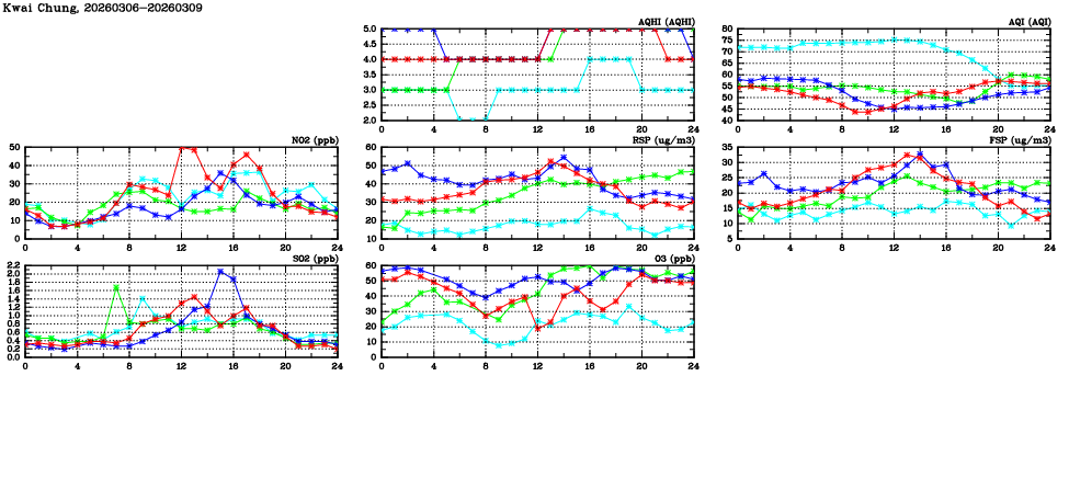 | Air Quality Data Time Series in Kwai Chung (2026/03/09) | ( Line colors: Day -3 Day -2 Day -1 Current day ) | 2D Map Current AQHI |