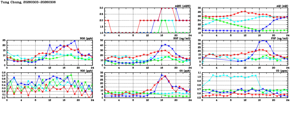 | Air Quality Data Time Series in Tung Chung (2026/03/06) | ( Line colors: Day -3 Day -2 Day -1 Current day ) | 2D Map Current AQHI |