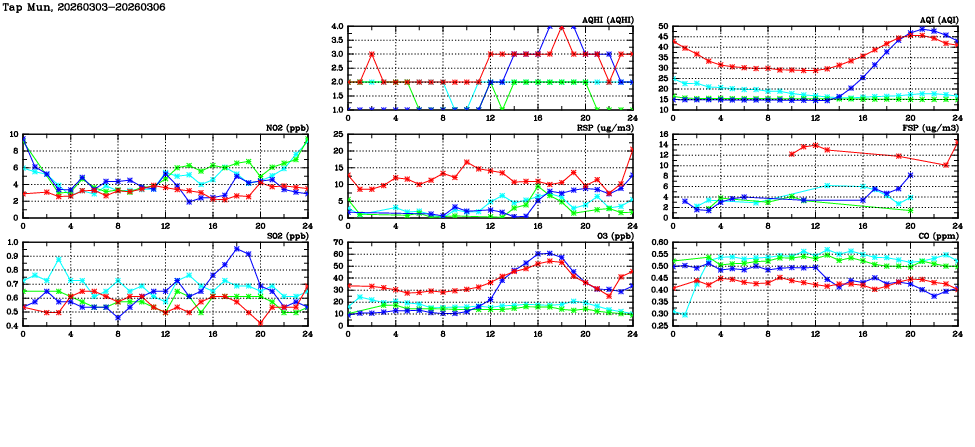 | Air Quality Data Time Series in Tap Mun (2026/03/06) | ( Line colors: Day -3 Day -2 Day -1 Current day ) | 2D Map Current AQHI |