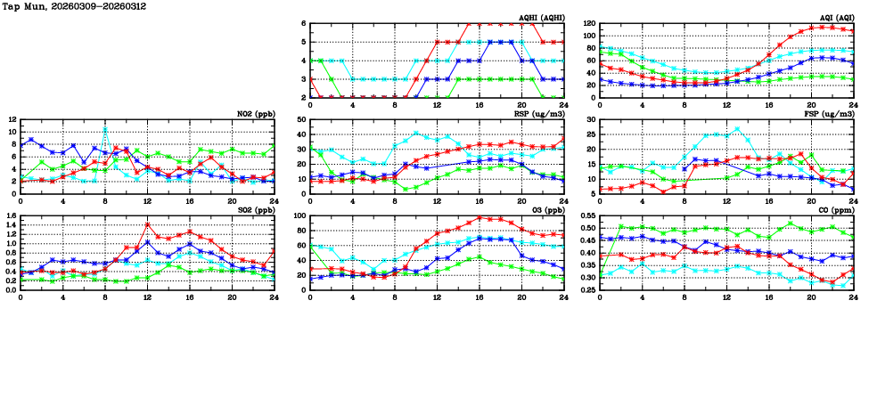 | Air Quality Data Time Series in Tap Mun (2026/03/12) | ( Line colors: Day -3 Day -2 Day -1 Current day ) | 2D Map Current AQHI |