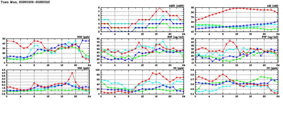 | Air Quality Data Time Series in Tuen Mun (2026/03/12) | ( Line colors: Day -3 Day -2 Day -1 Current day ) | 2D Map Current AQHI |