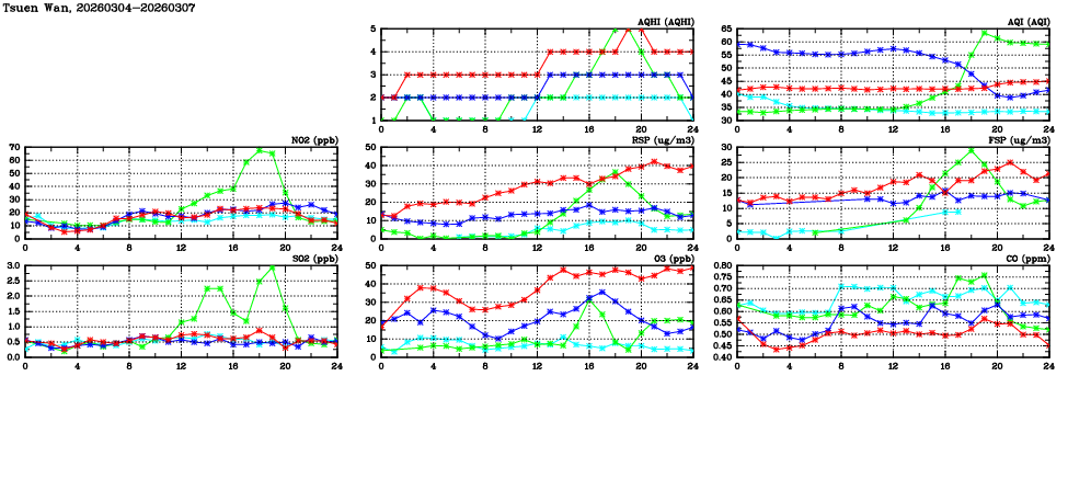 | Air Quality Data Time Series in Tsuen Wan (2026/03/07) | ( Line colors: Day -3 Day -2 Day -1 Current day ) | 2D Map Current AQHI |