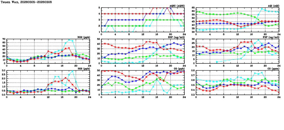 | Air Quality Data Time Series in Tsuen Wan (2026/03/08) | ( Line colors: Day -3 Day -2 Day -1 Current day ) | 2D Map Current AQHI |
