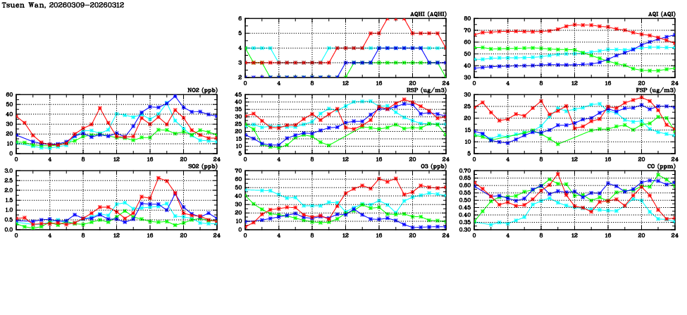 | Air Quality Data Time Series in Tsuen Wan (2026/03/12) | ( Line colors: Day -3 Day -2 Day -1 Current day ) | 2D Map Current AQHI |