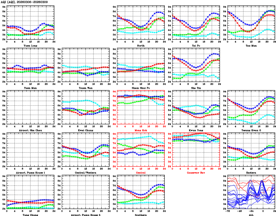| Air Quality Data Time Series for AQI (2026/03/09) | ( Line colors: Day -3 Day -2 Day -1 Current day ) | 2D Map Current AQHI |