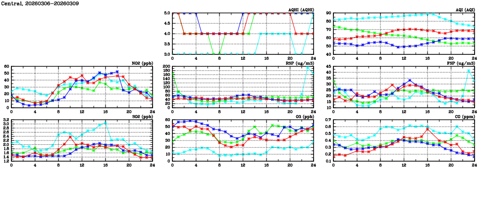 | Air Quality Data Time Series in Central (2026/03/09) | ( Line colors: Day -3 Day -2 Day -1 Current day ) | 2D Map Current AQHI |