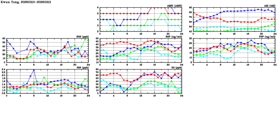 | Air Quality Data Time Series in Kwun Tong (2026/03/13) | ( Line colors: Day -3 Day -2 Day -1 Current day ) | 2D Map Current AQHI |