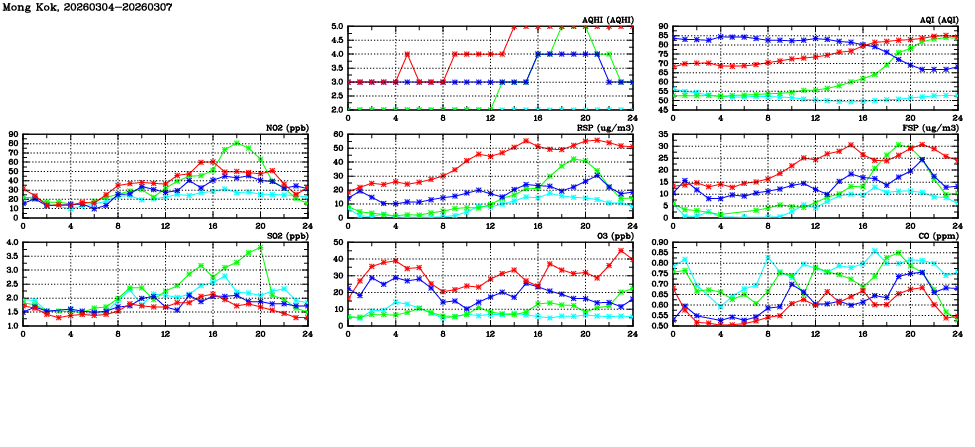 | Air Quality Data Time Series in Mong Kok (2026/03/07) | ( Line colors: Day -3 Day -2 Day -1 Current day ) | 2D Map Current AQHI |