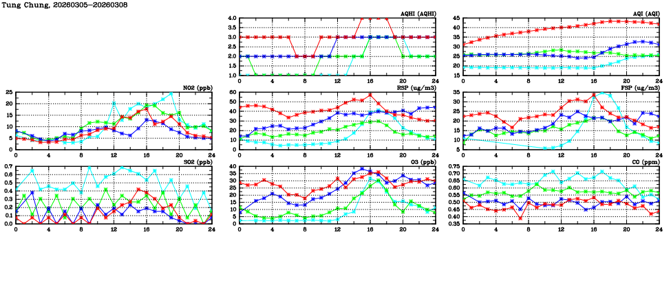 | Air Quality Data Time Series in Tung Chung (2026/03/08) | ( Line colors: Day -3 Day -2 Day -1 Current day ) | 2D Map Current AQHI |