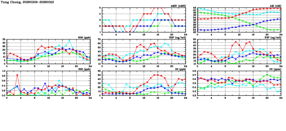 | Air Quality Data Time Series in Tung Chung (2026/03/12) | ( Line colors: Day -3 Day -2 Day -1 Current day ) | 2D Map Current AQHI |