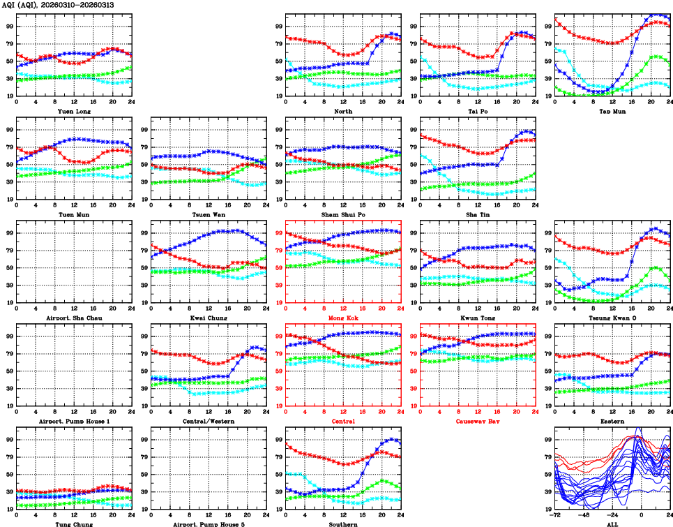 | Air Quality Data Time Series for AQI (2026/03/13) | ( Line colors: Day -3 Day -2 Day -1 Current day ) | 2D Map Current AQHI |