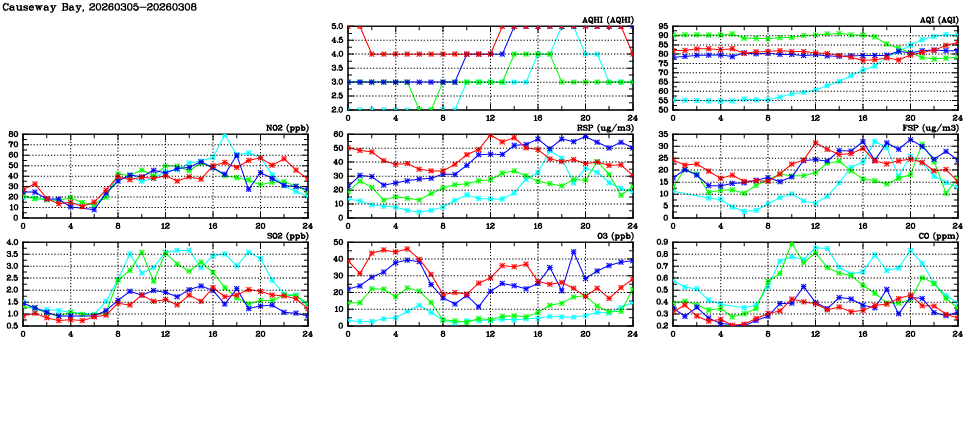 | Air Quality Data Time Series in Causeway Bay (2026/03/08) | ( Line colors: Day -3 Day -2 Day -1 Current day ) | 2D Map Current AQHI |
