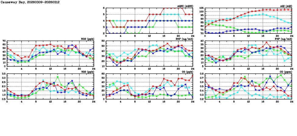 | Air Quality Data Time Series in Causeway Bay (2026/03/12) | ( Line colors: Day -3 Day -2 Day -1 Current day ) | 2D Map Current AQHI |