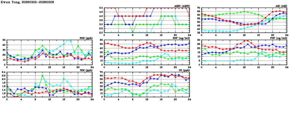 | Air Quality Data Time Series in Kwun Tong (2026/03/08) | ( Line colors: Day -3 Day -2 Day -1 Current day ) | 2D Map Current AQHI |