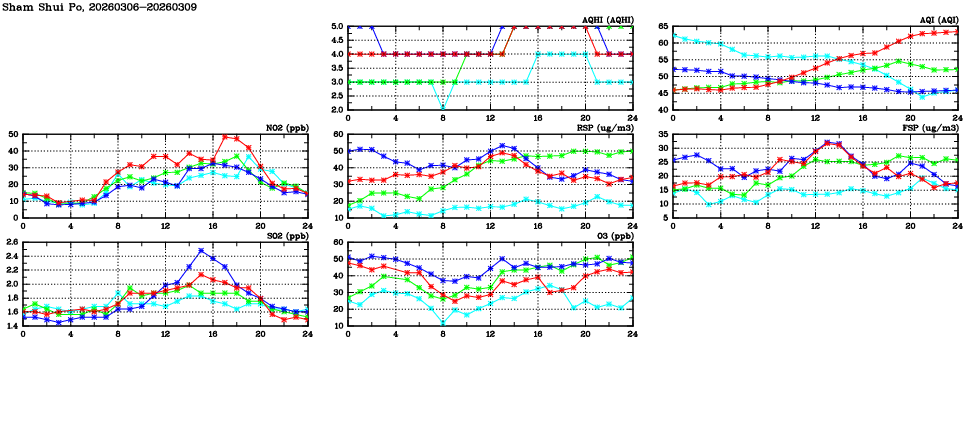 | Air Quality Data Time Series in Sham Shui Po (2026/03/09) | ( Line colors: Day -3 Day -2 Day -1 Current day ) | 2D Map Current AQHI |