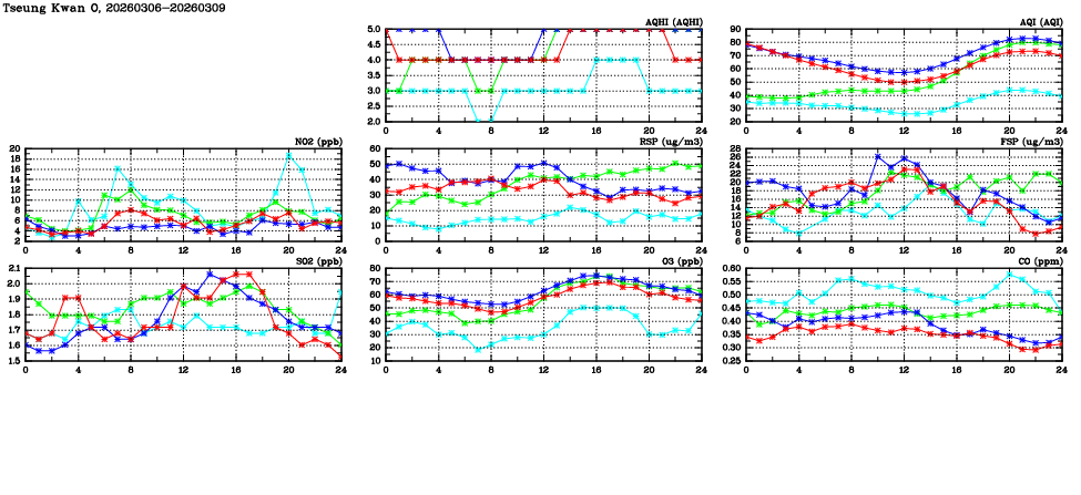 | Air Quality Data Time Series in Tseung Kwan O (2026/03/09) | ( Line colors: Day -3 Day -2 Day -1 Current day ) | 2D Map Current AQHI |