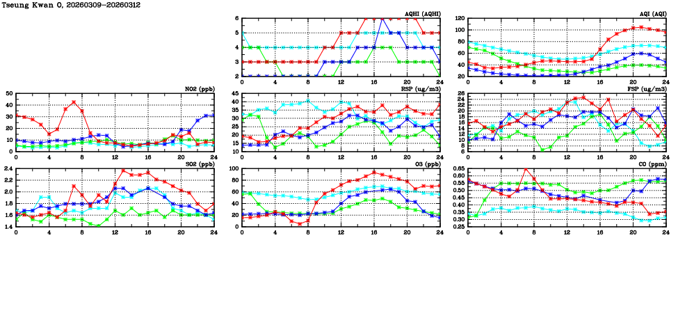 | Air Quality Data Time Series in Tseung Kwan O (2026/03/12) | ( Line colors: Day -3 Day -2 Day -1 Current day ) | 2D Map Current AQHI |