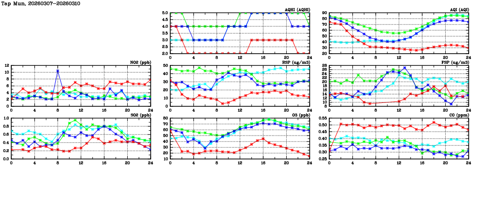 | Air Quality Data Time Series in Tap Mun (2026/03/10) | ( Line colors: Day -3 Day -2 Day -1 Current day ) | 2D Map Current AQHI |