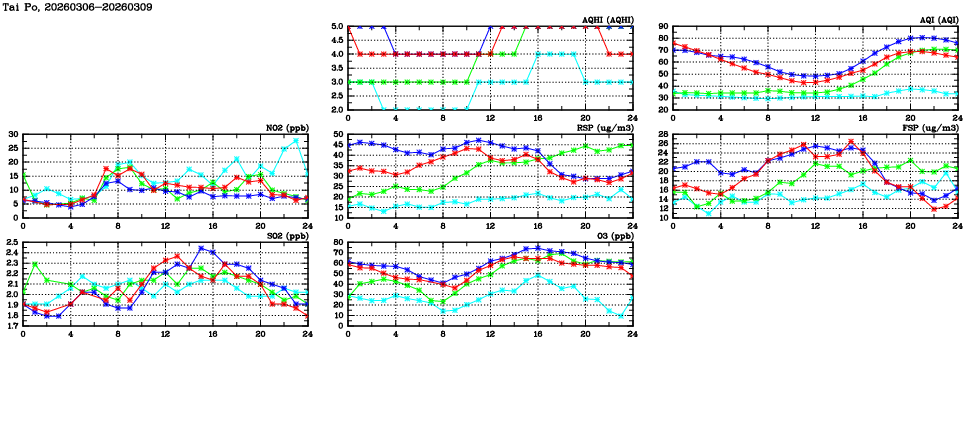 | Air Quality Data Time Series in Tai Po (2026/03/09) | ( Line colors: Day -3 Day -2 Day -1 Current day ) | 2D Map Current AQHI |