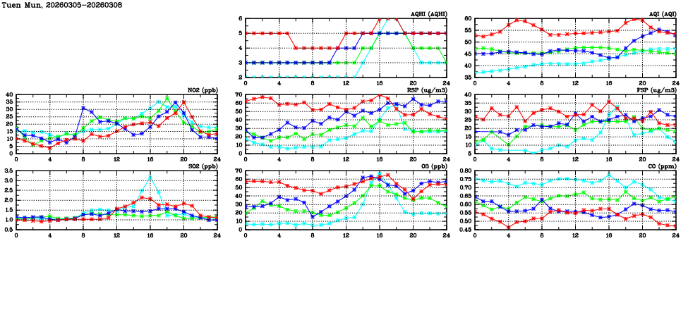 | Air Quality Data Time Series in Tuen Mun (2026/03/08) | ( Line colors: Day -3 Day -2 Day -1 Current day ) | 2D Map Current AQHI |