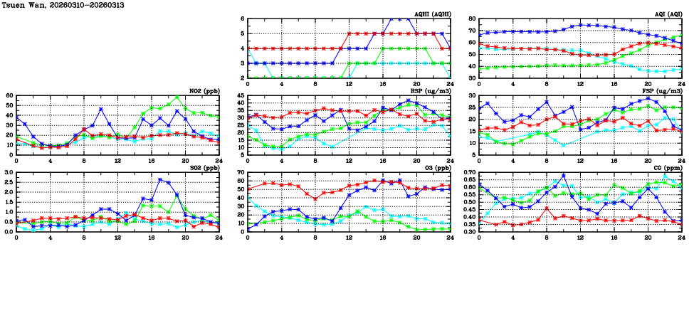 | Air Quality Data Time Series in Tsuen Wan (2026/03/13) | ( Line colors: Day -3 Day -2 Day -1 Current day ) | 2D Map Current AQHI |