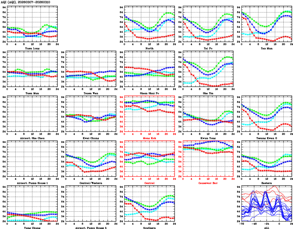 | Air Quality Data Time Series for AQI (2026/03/10) | ( Line colors: Day -3 Day -2 Day -1 Current day ) | 2D Map Current AQHI |