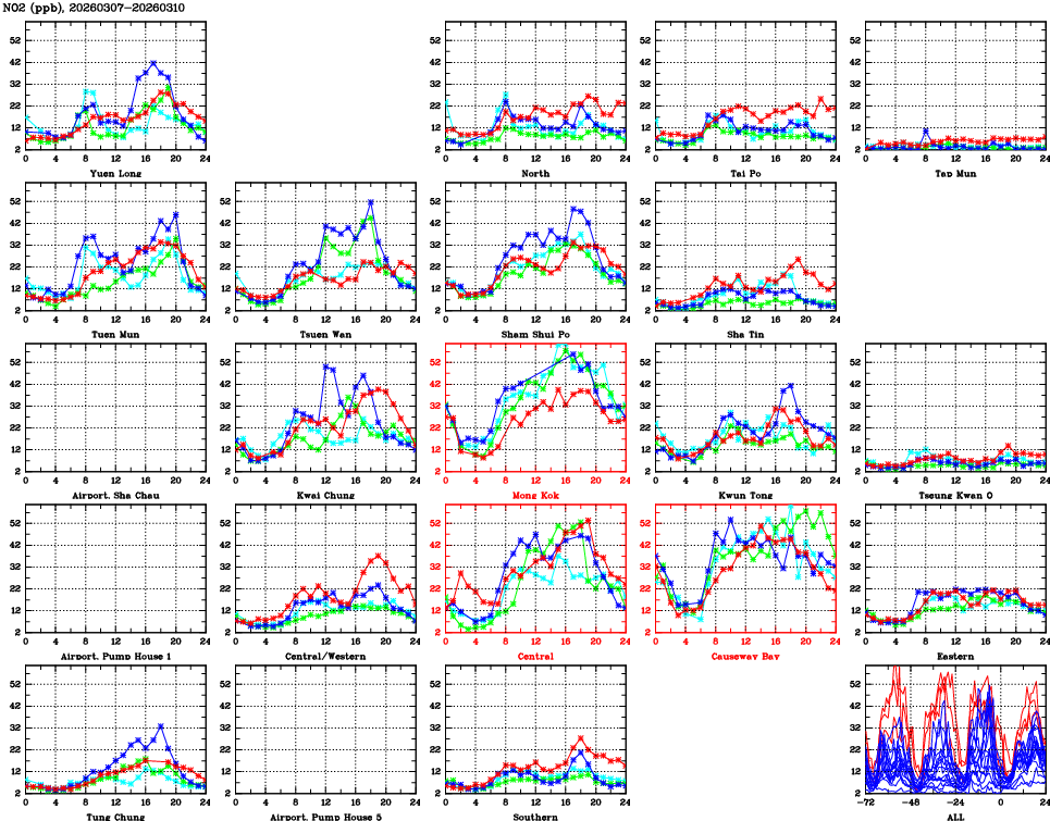 | Air Quality Data Time Series for NO2 (2026/03/10) | ( Line colors: Day -3 Day -2 Day -1 Current day ) | 2D Map Current AQHI |