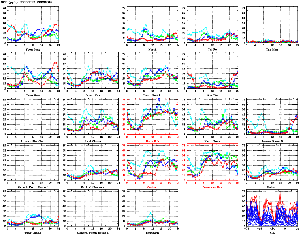 | Air Quality Data Time Series for NO2 (2026/03/15) | ( Line colors: Day -3 Day -2 Day -1 Current day ) | 2D Map Current AQHI |
