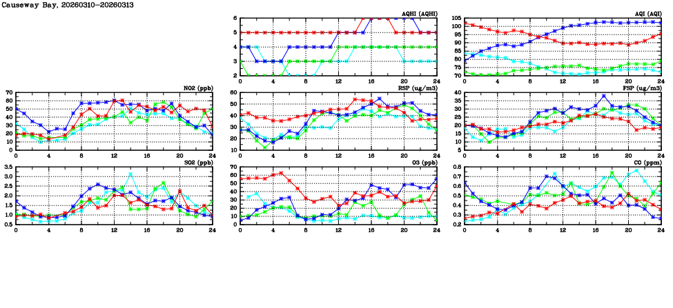 | Air Quality Data Time Series in Causeway Bay (2026/03/13) | ( Line colors: Day -3 Day -2 Day -1 Current day ) | 2D Map Current AQHI |
