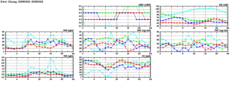 | Air Quality Data Time Series in Kwai Chung (2026/03/15) | ( Line colors: Day -3 Day -2 Day -1 Current day ) | 2D Map Current AQHI |