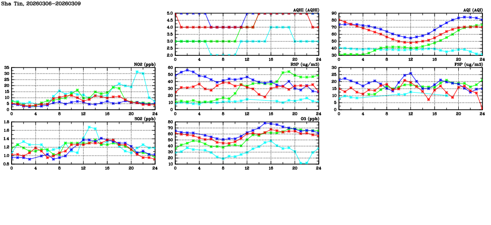 | Air Quality Data Time Series in Sha Tin (2026/03/09) | ( Line colors: Day -3 Day -2 Day -1 Current day ) | 2D Map Current AQHI |