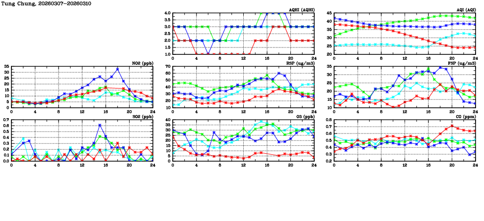 | Air Quality Data Time Series in Tung Chung (2026/03/10) | ( Line colors: Day -3 Day -2 Day -1 Current day ) | 2D Map Current AQHI |