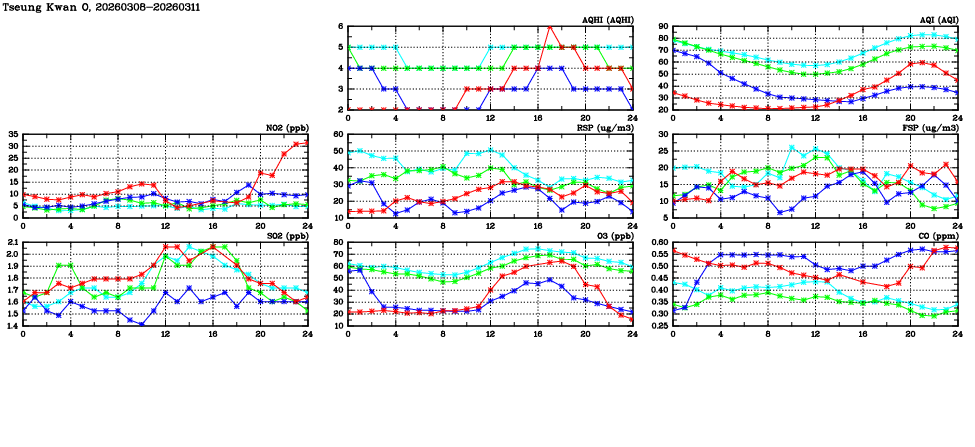 | Air Quality Data Time Series in Tseung Kwan O (2026/03/11) | ( Line colors: Day -3 Day -2 Day -1 Current day ) | 2D Map Current AQHI |