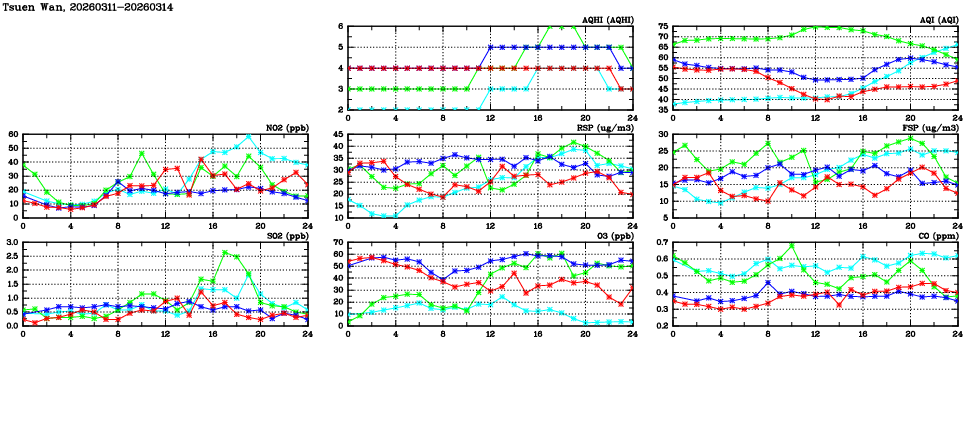 | Air Quality Data Time Series in Tsuen Wan (2026/03/14) | ( Line colors: Day -3 Day -2 Day -1 Current day ) | 2D Map Current AQHI |