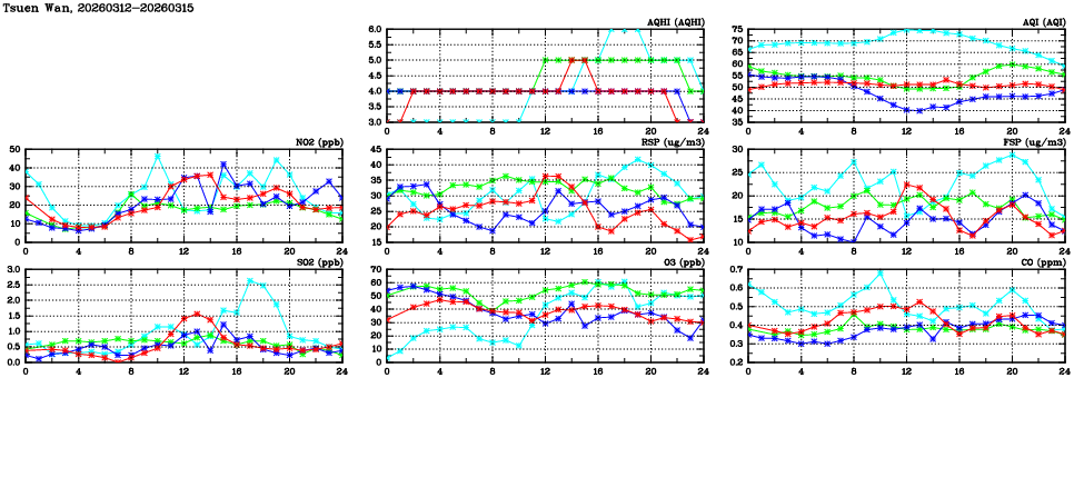 | Air Quality Data Time Series in Tsuen Wan (2026/03/15) | ( Line colors: Day -3 Day -2 Day -1 Current day ) | 2D Map Current AQHI |