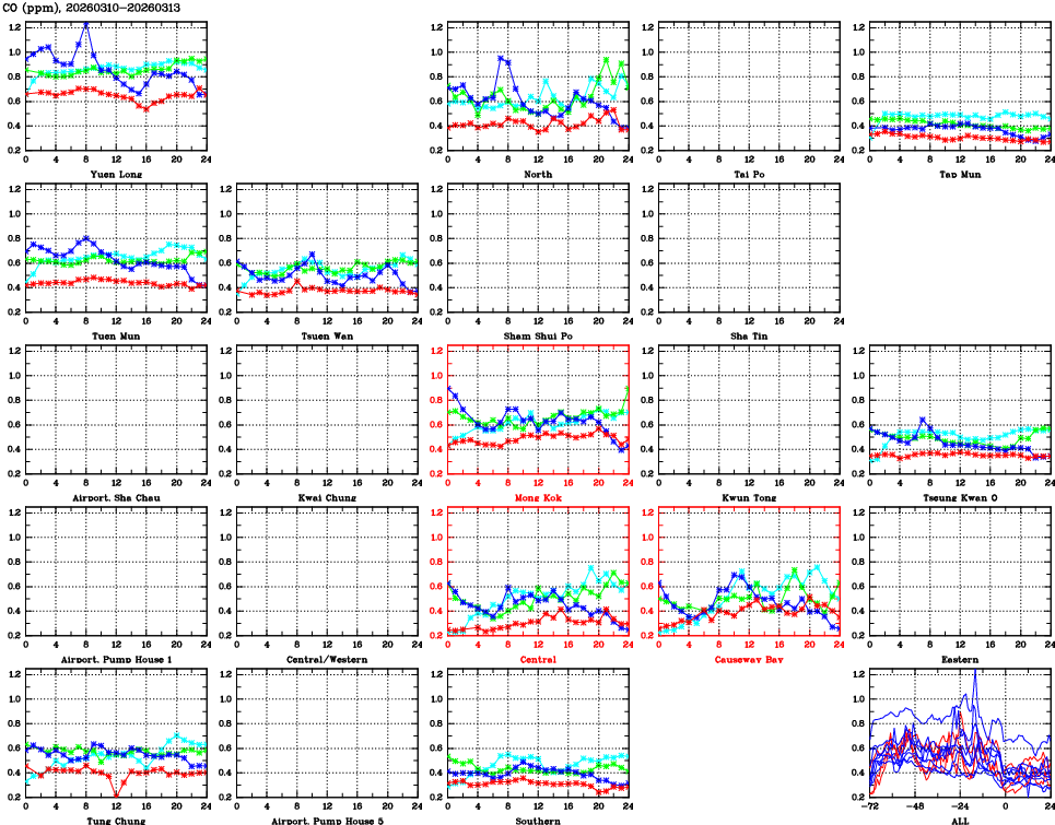 | Air Quality Data Time Series for CO (2026/03/13) | ( Line colors: Day -3 Day -2 Day -1 Current day ) | 2D Map Current AQHI |