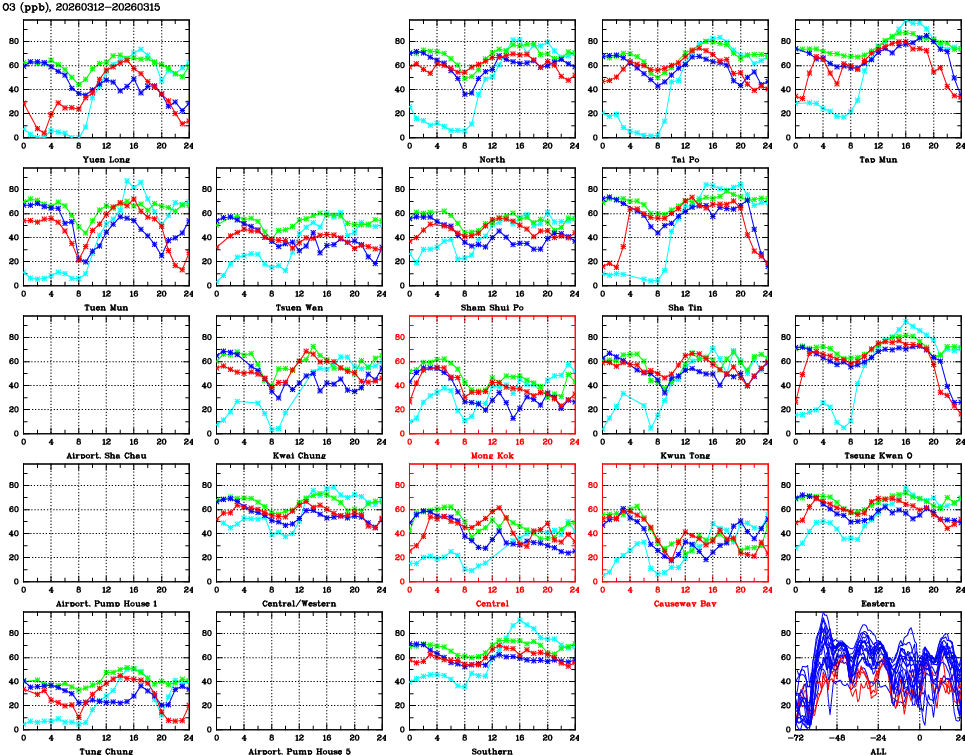 | Air Quality Data Time Series for O3 (2026/03/15) | ( Line colors: Day -3 Day -2 Day -1 Current day ) | 2D Map Current AQHI |