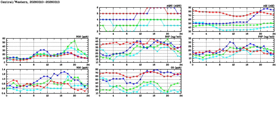 | Air Quality Data Time Series in Central/Western (2026/03/13) | ( Line colors: Day -3 Day -2 Day -1 Current day ) | 2D Map Current AQHI |