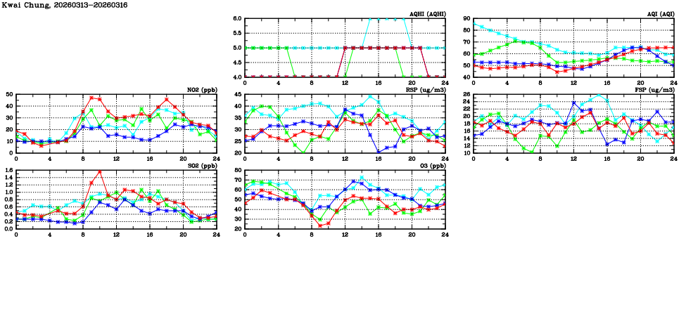 | Air Quality Data Time Series in Kwai Chung (2026/03/16) | ( Line colors: Day -3 Day -2 Day -1 Current day ) | 2D Map Current AQHI |