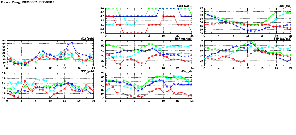 | Air Quality Data Time Series in Kwun Tong (2026/03/10) | ( Line colors: Day -3 Day -2 Day -1 Current day ) | 2D Map Current AQHI |