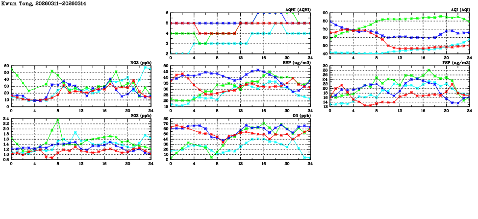 | Air Quality Data Time Series in Kwun Tong (2026/03/14) | ( Line colors: Day -3 Day -2 Day -1 Current day ) | 2D Map Current AQHI |