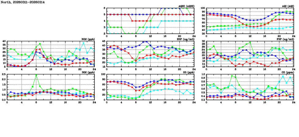 | Air Quality Data Time Series in North (2026/03/14) | ( Line colors: Day -3 Day -2 Day -1 Current day ) | 2D Map Current AQHI |