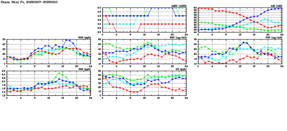 | Air Quality Data Time Series in Sham Shui Po (2026/03/10) | ( Line colors: Day -3 Day -2 Day -1 Current day ) | 2D Map Current AQHI |