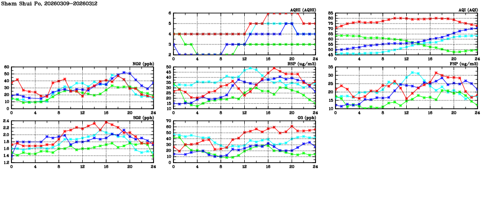 | Air Quality Data Time Series in Sham Shui Po (2026/03/12) | ( Line colors: Day -3 Day -2 Day -1 Current day ) | 2D Map Current AQHI |