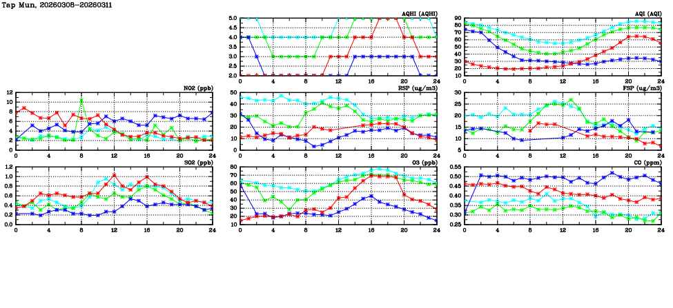 | Air Quality Data Time Series in Tap Mun (2026/03/11) | ( Line colors: Day -3 Day -2 Day -1 Current day ) | 2D Map Current AQHI |